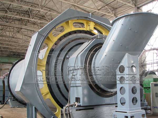 原煤由喂料設(shè)備進(jìn)入到磨機(jī)的進(jìn)料裝置中,溫度為300℃左右的熱風(fēng)也通過進(jìn)風(fēng)管進(jìn)入進(jìn)料裝置,含有水分的原煤在此處就開始進(jìn)行熱交換;當(dāng)原煤進(jìn)入磨機(jī)的烘干倉時(shí),由于烘干倉內(nèi)設(shè)有特制的揚(yáng)料板將原煤揚(yáng)起,使得原煤在此處進(jìn)行強(qiáng)烈的熱交換而得到烘干,烘干后的煤塊通過設(shè)有揚(yáng)料板的雙層隔倉板進(jìn)入粉磨倉。粉磨倉內(nèi)裝有研磨體(鋼球),煤塊在此倉內(nèi)被粉碎、研磨成煤粉。在煤塊被粉碎的同時(shí),由專用的引風(fēng)機(jī)經(jīng)過磨機(jī)的出料裝置將已粉碎的煤粉及氣體一同帶出磨機(jī),較粗的顆粒會(huì)經(jīng)過出料裝置的返料螺旋返回到粉磨倉內(nèi)進(jìn)行再次粉磨。